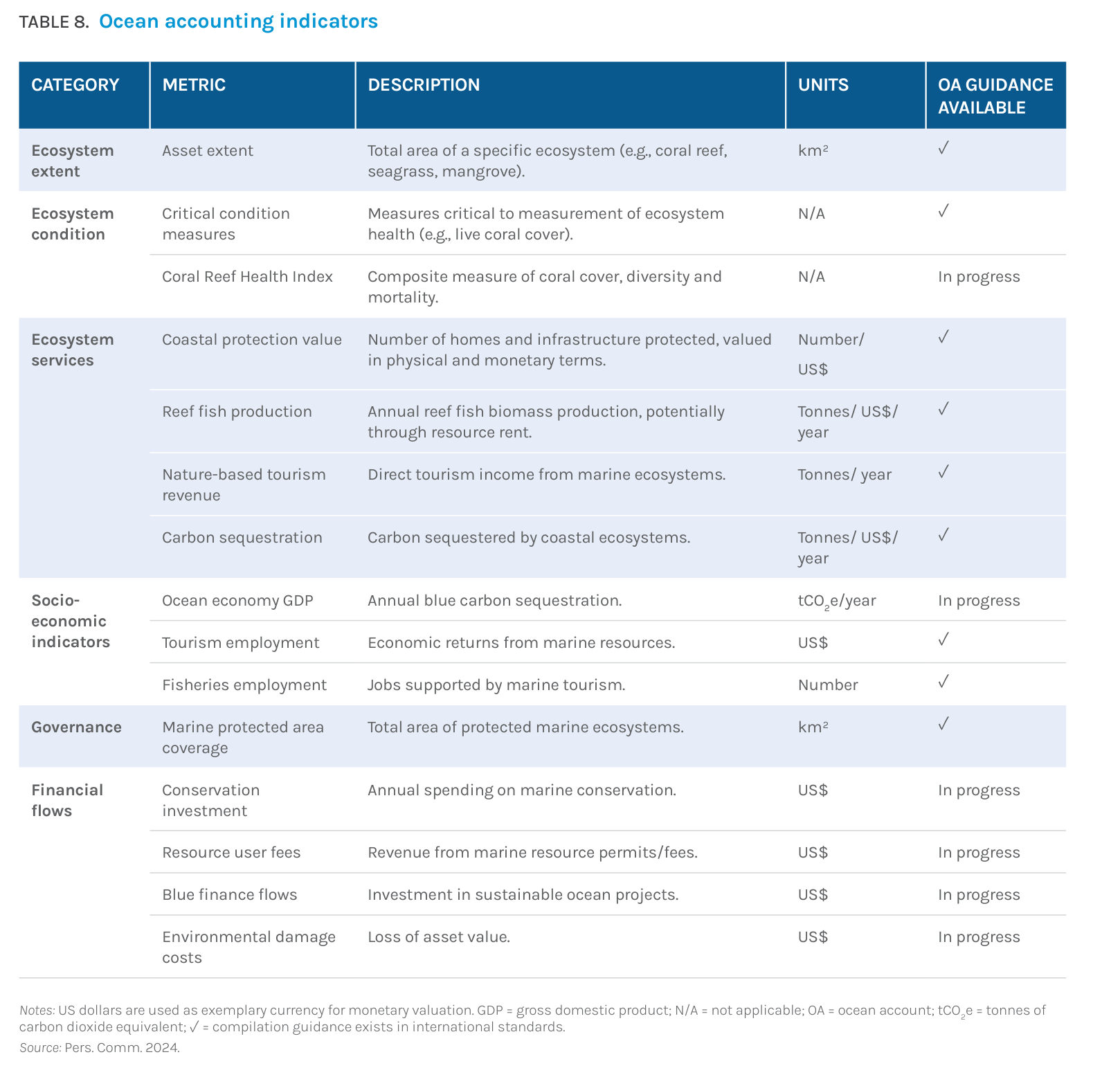 The Handbook provides an example list of economic, environmental and social indicators, which ocean accounts can contribute to.